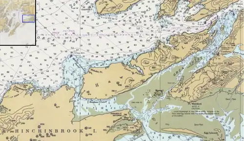 Orca Bay is on the north west and west sides of Hawkins Island, extending westward to Johnstone Point of Hinchenbrook Island. Its northwestern corner is demarcated by Knowles Head, between Port Gravina and Fidalgo Bay on the mainland.[1] Its eastern end can be reached from the port of Cordova, Alaska on Orca Inlet. According to the US Board on Geographic Names, Orca Bay was named for the Orca salmon cannery of the Pacific Steam Whaling Company, which operated on the southeast shore of Orca Inlet and in turn was named for that company's ship Orca. Ultimately the name is derived from the orca or killer whale.
