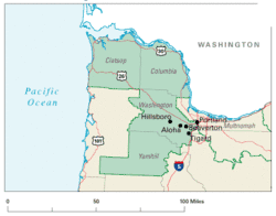 Oregon's 1st congressional district is a congressional district located in the U.S state of Oregon. The district stretches from Portland's western suburbs and exurbs, to parts of the Oregon coast. The district includes the principal cities of Beaverton, Hillsboro, and Tigard, all located in the Portland metropolitan area. Geographically, the district is located in the northwest corner of Oregon. It includes all of Clatsop, Columbia and Tillamook Counties, most of Washington County excluding the extreme southeast, and a portion of southwest Multnomah County in Portland. It generally includes most of Portland west of the Williamette River.