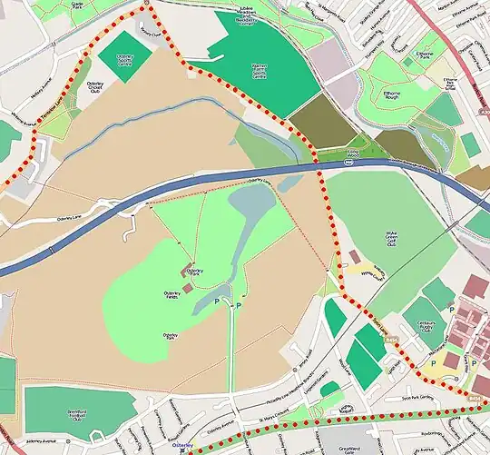 Osterley is on elevated soil,[2] bisected by the A4 (Great West Road), and extends north of the M4 motorway. Syon Lane forms the border to the east, while the border with Heston is to the west. Osterley extends south of the A4, including St Mary's Church.