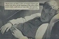 Literary critics of the day were eager to review Capote's novel. Mostly positive reviews came from a variety of publications including The New York Herald Tribune, but The New York Times published a dismissive review. Diana Trilling wrote in The Nation about Capote's "striking literary virtuosity" and praised "his ability to bend language to his poetic moods, his ear for dialect and varied rhythms of speech."[21] Capote was compared to William Faulkner, Eudora Welty, Carson McCullers, Katherine Anne Porter, and even Oscar Wilde and Edgar Allan Poe. Authors as well as critics weighed in; Somerset Maugham remarked that Capote was "the hope of modern literature."[22]