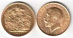 The Ottawa Mint sovereign is a British one pound coin (known as a sovereign) minted between 1908 and 1919 at the Ottawa Mint (known today as the Ottawa branch of the Royal Canadian Mint. This has augmented debate among Canadian numismatists because some view these pieces as Canadian while others view them as British and thus distinct from the decimal series of Canadian coinage.[1] Since the opening of the Ottawa Mint, the Dominion of Canada's government wanted to produce decimal gold coins.[1] As it was a branch of the Royal Mint, it was obligated to mint sovereigns on request.[1] When sovereigns were requested, it was usually for export causes. Gold used to produce sovereigns initially came from British Columbia or the Yukon. [2]
