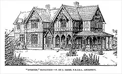 In June 1959 it was noted that the station was retained following negotiations with Mr N F Arkwright.[3] Until 1926 the station was surrounded by the Overton estate.[8] The estate was bought about 1882 by Francis Arkwright, who stood as a Member of Parliament for the seat of Rangitīkei, but was defeated in 1887 and 1890. He had a large Tudor revival house built in 1884. In 1990 the House was registered by Heritage New Zealand as a Category I heritage item, with registration number 187.[9]