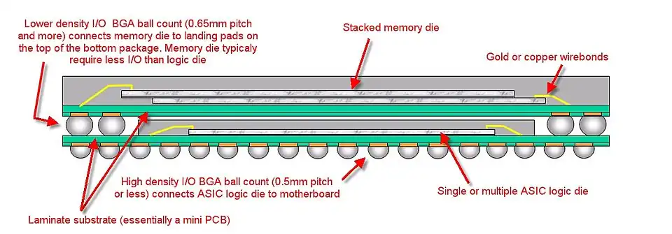 - Mixed logic-memory stacking: logic (CPU) package on the bottom, memory package on top. For example, the bottom could be a system on a chip (SoC) for a mobile phone. The logic package is on the bottom because it needs many more BGA connections to the motherboard.
