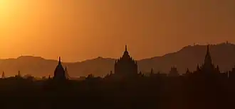 By the mid-10th century, Burmans at Pagan had expanded irrigation-based cultivation while borrowing extensively from the Pyus' predominantly Buddhist culture. Pagan's early iconography, architecture and scripts suggest little difference between early Burman and Pyu cultural forms. Moreover, no sharp ethnic distinction between Burmans and linguistically linked Pyus seems to have existed.[32] The city was one of several competing city-states until the late 10th century when it grew in authority and grandeur.[32] By Anawrahta's accession in 1044, Pagan had grown into a small principality—about 320 kilometres (200 mi) north to south and about 130 kilometres (81 mi) from east to west, comprising roughly the present districts of Mandalay, Meiktila, Myingyan, Kyaukse, Yamethin, Magwe, Sagaing, and the riverine portions of Minbu and Pakkoku. To the north lay the Nanzhao Kingdom, and to the east still largely uninhabited Shan Hills, to the south and the west Pyus, and farther south still, Mons.[33] The size of the principality is about 6% of that of modern Burma/Myanmar.