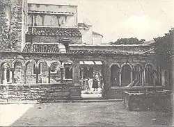 The cloister, adjacent to the east side of the church, is dated to the early 12th century,[18][note 8] and would be contemporary with that of the church of San Giovanni in Valle in Verona. Of the four perimeter sides formed by colonnades, only three remain; in fact, the western side was replaced by a gate in recent times. The colonnades located to the north and east are covered by a roof, formed of barrel tiles and large stone roof tiles. In the center is placed a rustic well.