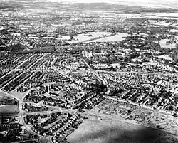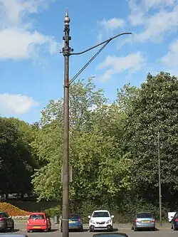 However, there was interest in developing housing, and a suburb began to develop around Lidgett Park.[12] Development was accelerated in 1884 by the provision of a horse-drawn public omnibus service between Leeds and Roundhay Park, then a horse-drawn tram and, on 11 November 1891, the first public electric tram service, which by 1894 provided a quarter-hourly service from 6 a.m.[7] The city sold surplus land, but placed restrictions in its use, stipulating stone for building and the prohibition of offensive trades.[2]