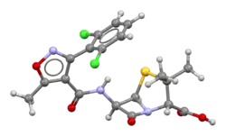 Dicloxacillin is a narrow-spectrum β-lactam antibiotic of the penicillin class.[1] It is used to treat infections caused by susceptible (non-resistant) Gram-positive bacteria.[1] It is active against beta-lactamase-producing organisms such as Staphylococcus aureus, which would otherwise be resistant to most penicillins. Dicloxacillin is available under a variety of trade names including Diclocil (BMS).[2]