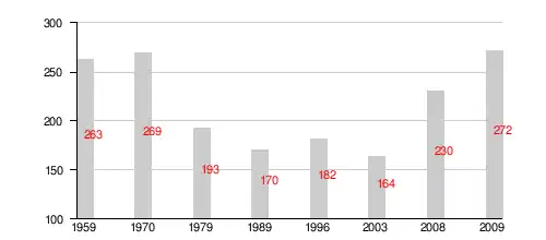 | Year | 1959 | 1970 | 1979 | 1989 | 1996 | 2003 | 2008 | 2009 |
