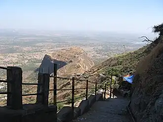 • Kalikamata Temple, now a famous Hindu pilgrim center which was once a Jain site, is located at Pavagadh. Situated amid dense forest cover on a cliff, the temple is believed to be one of the 51 Shakti Peeths. Maa Mahakalika Udan Khotala (A Passenger Ropeway) is operating since 1986 and takes you quickly and comfortably from Manchi to the hilltop near the Maha Kalika Temple in about 6 minutes, whereas, the steep climb on foot takes over one hour. The temple of Kali is at the height of 550 metres (1,523 feet). A rope-way facility has been made available (commissioned in 1986[11]) to the tourists to reach the temple. About 250 steps have to be climbed from there.