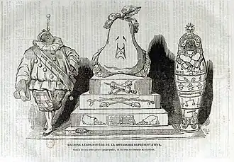 The pear became closely associated with King Louis-Philippe and is considered an emblem of the July Monarchy.[4][5] This association has led to two common misconceptions: the belief that "pear" referred to a fool at the time, justifying its use, and the incorrect attribution of the emblem's creation to Honoré Daumier, when Charles Philipon claiming it as his own.[6][7]