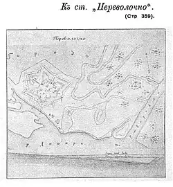 Perevolochna (Ukrainian: Переволочна) is a former fortress and town in the Polish–Lithuanian Commonwealth and Cossack Hetmanate, and later a village in Poltava Oblast. Before the establishment of Kamianske Water Reservoir in the 1960s, here also existed a river crossing. The settlement was situated at the bank of the Dnieper near the mouth of Vorskla River,[1] where a ford across Dnieper enabled people to cross the river, hence its name.[2] The crossing Perevolochna – Mishuryn Rih was also a key crossing during the Battle of the Dnieper in October 1943.