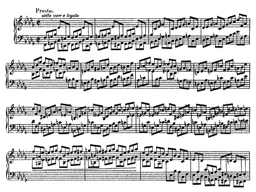 2 time, is a perpetuum mobile in "relatively simple" binary form[note 7] consisting of parallel octaves played sotto voce e legato (similarly to the Prelude in E♭ minor, Op. 28 No. 14) and not a single rest or chord until the final bars with a sudden fortissimo B♭ bass octave and a B♭ minor chord ending the whole piece. In this movement, "a complicated chromaticism is worked out in implied three- and four-part harmony entirely by means of one doubled monophonic line";[35] very similarly, the five measures that begin J. S. Bach's Fugue in A minor (BWV 543) imply a four-part harmony through a single monophonic line.[36] Garrick Ohlsson remarked that the movement is "extraordinary, because he’s written the weirdest movement he's ever written in his whole life, something which truly looks to the 20th century and post-romanticism and atonality".[37] Additionally, Leikin describes the finale as "probably the most enigmatic piece Chopin ever wrote",[20] and Anton Rubinstein is said to have remarked that the fourth movement is the "wind howling around the gravestones".[38]