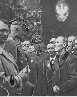 It was one of the centers of Silesian Uprisings and in 1922 was ceded to the Second Polish Republic by Weimar Germany as 86% of the population voted for joining the re-established Polish state. In June 1922, a symbolic ceremony of reintegration of Piekary with Poland took place. Polish Uhlans under the command of Stanisław Szeptycki entered Piekary, greeted by the St. Mary church by the local populace led by Wawrzyniec Hajda, local Polish independence activist and poet, nicknamed the "Silesian Wernyhora".[4] On July 10, 1939, Piekary Śląskie received city rights with effect from 1940. As a result of the outbreak of World War II, the actual implementation of this law did not take place until 1947.[4]