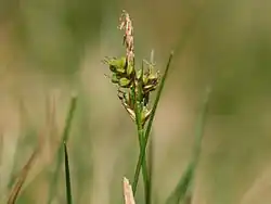 The inflorescence comprises a single, terminal, male (staminate) spike, and 2–4 lateral female (pistillate) spikes.[3] The spikes are clustered together, and the whole inflorescence is 1–4 cm (0.4–1.6 in) long.[3] The female spikes are 4–8 mm (0.16–0.31 in) long, ovoid or approaching spherical,[3] and contains 5–15 flowers.[4] The female spikes are attached directly to the stem, and each is subtended by a bract which does not form a sheath.[3] The male spike is 8–15 mm (0.3–0.6 in) long and much narrower.[3]