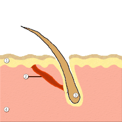 1) Epidermis 2) Arrector pili muscle 3) Hair follicle 4) Dermis The diagram shows that the arrector pili muscle is connected to the hair follicle and the epidermis resulting in the erection of the hair during muscle contraction causing goose bumps.