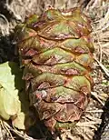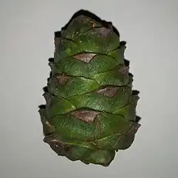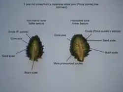 The pine cones of the tree resemble the cones of the Siberian pine (P. sibirica). The cones are larger and thicker and not as much elongated as Japanese stone pine (P. pumila) cones. On average the cones are 4 cm long and 3 cm wide. Each cone contains 40 nut-like seeds. Seeds are on average 8 mm long. Only about 15% (at most) of the seeds in the cones are fertile. Ripe cones are purple, just like those of P. sibirica. Seed development and production are very poor in the putative hybrids, indicating that introgression occurs very slowly or does not occur beyond the first filial generation.[1]