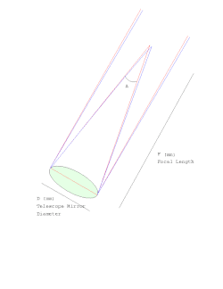 If focal length f is measured in millimeters, the plate scale in radians per millimeter is given by angular separation θ, and the linear separation of the image at the focal plane s, or by simply the focal length f: since