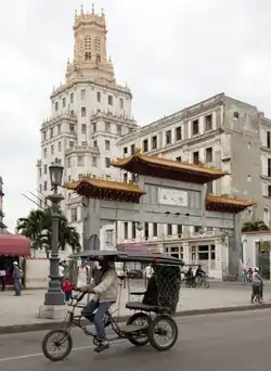The district has two paifang,[24] the larger one located on Calle Dragones. The long-neglected Chinatown in Havana, Cuba, received materials for its paifang from the People's Republic of China as part of the Chinatown's gradual renaissance. China donated the materials in the late 1990s.[25] It has a well defined written welcoming sign in Chinese and Spanish. The smaller arch is located on Zanja strip. Cuba's Chinese boom ended when Fidel Castro's 1959 revolution seized private businesses, sending tens of thousands of business-minded Chinese fleeing, mainly to the United States. Descendants are now making efforts to preserve and revive the culture.[10] Many of the businesses in the Plaza del Vapor were operated and owned by Chinese Cubans.