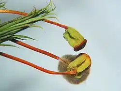 The plants are sexually dioicous. Fertilization occurs when raindrops splash sperm from male splash-cups onto female plants containing eggs.[6] The fertilized egg develops into a sporophyte, which contains a spore capsule high above a stalk.[7] The leaves of the perichaetium have a long sheath with a scarious (i.e. membranous) margin, while the blades themselves are greatly reduced, gradually narrowing to a finely acuminate tip. These blades have toothed margins, are denticulate to subentire in outline, roughened to almost smooth, and have a costa that is excurrent. The seta, or capsule stalk, is 5 to 9 cm long, and is stout and yellowish to reddish brown in colour. The capsule is 3 to 6 mm long, slightly rectangular to cubic in shape, and brown to dark reddish brown in colour. It is sharply 4 winged, inclined to horizontal, and glaucous when fresh. The peristome measures 250 μm, is pale in colour and has 64 teeth. The calyptra is golden yellow to brownish and completely envelops the capsule. The spores measure 5 to 8 μm, but may be up to 12 μm.[3]