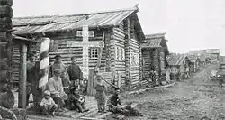 One important aesthetic feature of Pomor culture is Mezen painting, a highly symbolic style for wood and household objects, as well as the style of Palashchelye, where Pomor painting was originally developed. These are uniquely rooted in the local geography, however syncretic, combining influences not only from South Russian peasants but also the Far East, India, decorative motives of Turkic people and Greece, including swastika motifs of pre-Aryan origin. Items like tuesa (storage boxes), polotuhi (flat boxes) and koroba (baskets) were made from birch bark. There was also a strong tradition of ceramic production, with the Pomor pottery craft rooting from the village of Timoschel’e, while metalwork like copper casting was based around Kimzha.[10] Another one of Pomorye's most important artistic traditions is Kholmogory bone carving.[31] Pomor houses were traditionally very big and populated by extended families, with each of them possessing a two-story house including a gallery and a ramp, cellars, a bathhouse, a stable, granaries, and often a mill, all inside. The doors to those houses were traditionally left unlocked, one of their oldest customs. In gardens, 2–3 meters high votive or funerary crosses could regularly be found, as until the Soviet revolution the dead were buried next to their home.[10]