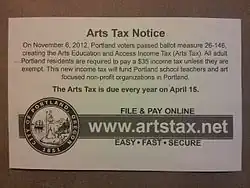The Portland Arts Tax, formally the Arts Education and Access Income Tax, is a $35 tax paid by residents of Portland, Oregon to support school teachers and art focused nonprofit organizations. Residents age eighteen or older with $1,000 or more of taxable income are required to pay the tax.[1] The tax was instituted when Portland voters passed Oregon Ballot Measure 26-146 in November 2012.[2]