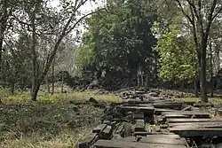 There is little historical data about Preah Khan Kompong Svay. Some French scholars have argued that it was founded in the 11th century, probably by Suryavarman I.[2]: 136 [3]: 95 Evidence from sediment analysis suggests that the site was fully abandoned during the late 14th to 15th century, with maintenance of temples and infrastructure ceasing around the mid-14th century.[4] The complex is notable for its use as a royal residence during the kingdom of Suryavarman II and as a military outpost for Jayavarman VII during conflicts with the Cham in the late 12th century.[1][5]