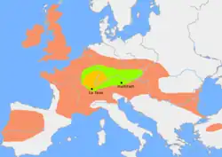 The green area suggests a possible extent of (proto-)Celtic influence around 1000 BC. The orange area shows the region of birth of the La Tène style. The red area indicates an idea of the possible region of Celtic influence around 400 BC.