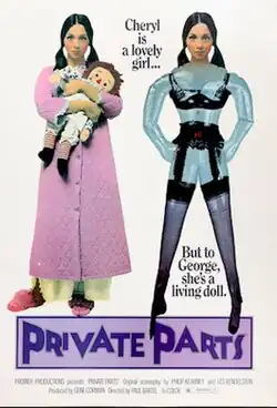 Private Parts is a 1972 American horror film[4] directed by Paul Bartel in his feature film debut, and starring Ayn Ruymen, Lucille Benson, and John Ventantonio. Its plot follows a troubled young woman who suspects a deviant serial killer is living in her aunt's dilapidated hotel in downtown Los Angeles. The film has been noted for its stylistic mixture of horror, dark comedy, and psychological thriller elements.[5]