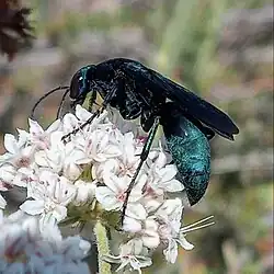 Psorthaspis planata is a spider-hunting wasp of western North America, mostly commonly observed in the Californias.[1] Prey species include the California trapdoor spider.[2] According to entomologist J. Chester Bradley in 1944, the females of Psorthaspis planata have "the tops of the eyes remote from the top of the head, and the ocelli placed low. The males have purplish tomentum and wholly black wings, like the females."[3]:โ52โ
