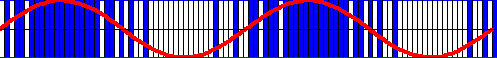 An example of PDM of 100 samples of one period of a sine wave. 1s represented by blue, 0s represented by white, overlaid with the sine wave.