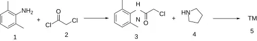 Amide formation between 2,6-Dimethylaniline (1) and Chloroacetyl chloride (2) gives [1131-01-7] (3). Displacement of the remaining halogen by pyrrolidine (4) completed the synthesis of Pyrrocaine (5).