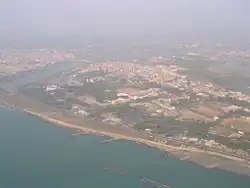 An aerial view of northern Cieding District where the Erren River reaches the Taiwan Strait; north of the river, in the left hinterground of the photo, is the South District of Tainan City