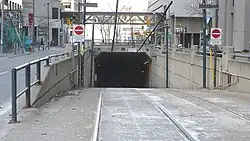 Between 2014 and 2018, 26 motorists inadvertently drove through the Queens Quay tunnel portal via the streetcar ramp on Queens Quay West between York and Bay streets and became trapped in the tunnel.[6] It took the TTC anywhere from 15 minutes to 5 hours to extract trapped vehicles. In 2016, one automobile reached Union station despite the tunnel having no provision for rubber-tire vehicles, with streetcar tracks protruding from a shallow trench. In April 2017, to prevent motorist invasions, the TTC made changes at the tunnel entrance by lowering warning lights closer to driver eye level, by placing a flashing light on a pole between the tracks, by adding rumble strips and by adding signs on posts that also narrow the passage to the tunnel.[7] However, despite these efforts, another motorist drove down the ramp on October 18, 2017, and became trapped in the trench at the bottom.[8] The 24th incident of automobile intrusion occurred on March 17, 2018, spurring the TTC to take further precautions.[9] On April 22, 2018, the TTC added 6 new bollards at the east side of the intersection of Queens Quay West and York Street to obstruct drivers from driving onto the right-of-way and into the tunnel.[10] Further, in late July 2018, the TTC installed two gates at the top of the ramp to the tunnel which can be opened in 3 seconds by a transponder on an approaching streetcar.[11]