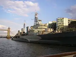 Following a task of rowing on the River Thames, teams traveled along the river to finish the leg on HMS Belfast.