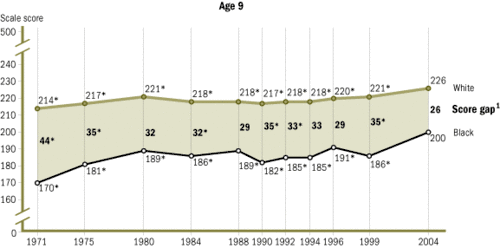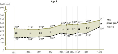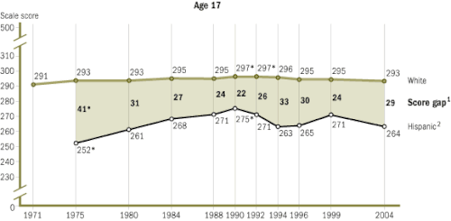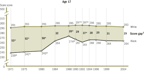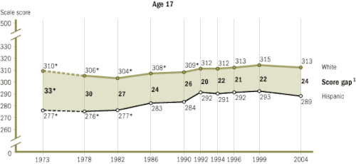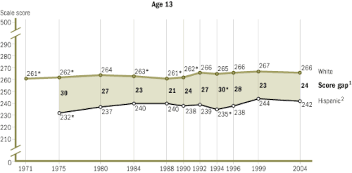 The National Assessment of Educational Progress (NAEP) has been testing seventeen-year-olds since 1971. From 1971 to 1996, the black-white reading gap shrank by almost one half and the math gap by almost one third.[32] Specifically, blacks scored an average of 239 points, and whites scored an average of 291 points on the NAEP reading tests in 1971. In 1990, blacks scored an average of 267, and whites scored an average of 297 points. On NAEP math tests in 1973, blacks scored an average of 270, and whites scored 310. In 1990, black average score was 289 and whites scored an average of 310 points. For Hispanics, the average NAEP math score for seventeen-year-olds in 1973 was 277 and 310 for whites. In 1990, the average score among Hispanics was 284 compared with 310 for whites.[21]