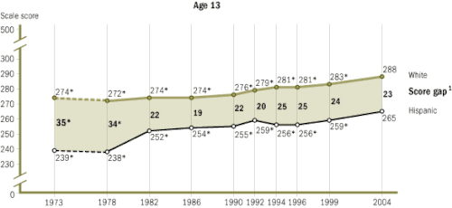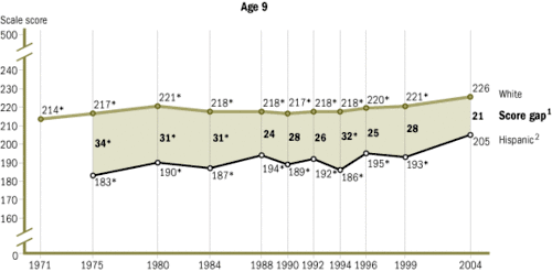 The NAEP has since collected and analyzed data through 2008. Overall, the White-Hispanic and the White-Black gap for NAEP scores have significantly decreased since the 1970s.[33] The Black-White Gap demonstrates:[33]
