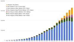 | Hispanic (of any race) | 2,021,820[27] | 3,231,409[27] | 5,814,784[27] | 8,920,940[27] | 14,608,673 | 22,354,059 | 35,305,818 | 50,477,594 | 62,080,044 | |