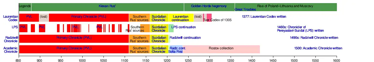 - a copy of the Primary Chronicle (Povest' vremmenykh let' (PVL), "Tale of Bygone Years") until the year 1116, the text of which groups it with the Laurentian Codex (Lav.), the Academic Chronicle (Aka.), and the remnants of the lost Trinity Chronicle (Tro.);[3][4]