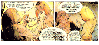 Rahan receives his necklace from his dying adoptive father. Illustration by André Chéret.