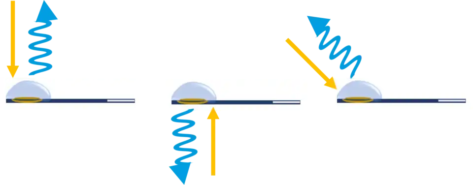 Raman-SEC configurations. The first picture shows the normal arrangement, the second the inverted microscope configuration and the last the angle arrangement. All of them are shown on screen-printed electrodes.