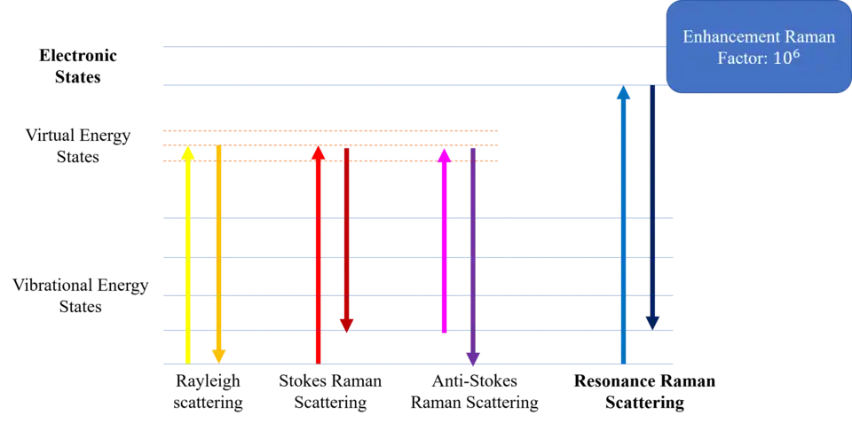 The Raman resonance effect produces an increase in Raman intensity up to 106 times. In this phenomenon, the monochromatic light interaction with the sample produces the transition of the molecules from the fundamental state to an excited electronic state, instead of a virtual state as in normal Raman spectroscopy. This phenomenon of increased intensity could be observed in materials such as carbon nanotubes.[9]