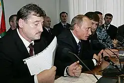 During the First Chechen War, together with his father, Ramzan Kadyrov fought against Russian armed forces.[7][33] After the war, Ramzan was the personal driver and bodyguard of his father Akhmad, who became the separatist mufti of Chechnya.[34] The Kadyrovite militia was formed during the First Chechen War,[35] when Akhmad Kadyrov declared jihad against Russia. The family defected to the Russian side at the beginning of the Second Chechen War in 1999. Since then, Kadyrov led his militia with support from Russia's Federal Security Service (FSB), including the provision of service ID cards, becoming the head of the Chechen Presidential Security Service. The militia later became known as the Kadyrovites.[36]