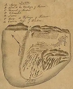 Diseños are hand-drawn maps submitted to the U.S. government indicating the extent of a land grant as understood by the grantees.[9] Diseños and expedientes (written descriptions of the grants) were used during the U.S. land-patent process that began when Mexican Alta California became the U.S. state of California in 1850.[9] Diseños are distinct from later maps produced by U.S. surveyors within the extant American rectangular survey system.[9] Several of the earliest surveys, or plats, of Los Angeles-area ranchos were done by Henry Hancock, who himself owned Rancho La Brea and through his son is a namesake of the Hancock Park neighborhood. As for the cattle brands, many of the large ranchos had multiple brands for various herds or during various eras; the single one included here is the earliest known example.[10] Land patents were ultimately granted to over 60 Mexican, Anglo and indigenous Angelenos; the indigenous contingent was represented by Doña Victoria Reid of Rancho Huerta de Cuati, who was Gabrieleño Tongva, and Odón Chihuya, Urbano Chari, and Manuel (later Espíritu Chijulla) of Rancho El Escorpión, who were from a leading family of Fernandeño Tongva.[3] The largest confirmed grant was Ex-Mission San Fernando, the smallest was San Gabriel Mission.[6]