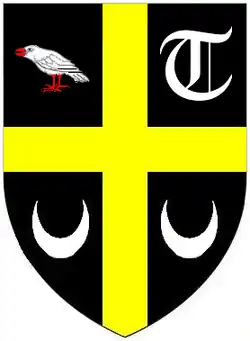 Arms of Rashleigh of Cornwall: Sable, a cross or between in the first quarter: a Cornish chough, argent beaked and legged gules; in the second quarter: a text "T"; in the third and fourth quarters: a crescent all of the third[1]
