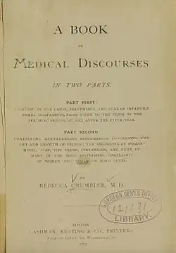 In 1883, Crumpler published A Book of Medical Discourses[18] from the notes she kept over the course of her medical career. Dedicated to nurses and mothers,[1][2] it focused on the medical care of women and children.[19] Her main desire in presenting this book was to emphasize the "possibilities of prevention".[20] Therefore, she recommended that women should study the mechanisms of human structure before becoming a nurse in order to better enable themselves to protect life. However, Crumpler stated that most nurses did not agree with this and tended to forget that for every ailment, there was a cause and it was within their power to remove it.[20] Although her primary focus was on the health of women and children, which seemed to be influenced by homeopathy, Crumpler recommended courses of treatment without stating that the treatment was homeopathic. She did not mention that medicine could be harmful, but stated the conventional amount of standard medicine usage.[13] Her medical book is divided into two sections: in the first part she focuses on preventing and mitigating intestinal problems that can occur around the teething period until the child is about five years of age;[10] the second part mainly focused on the following areas: "life and growth of beings", the beginning of womanhood and the prevention and cure of most of the "distressing complaints" of both sexes.[21] Although the book was focused on medical advice, Crumpler also ties in autobiographical details that contain political, social, and moral commentary.[22] Specifically in the first chapter, Crumpler gave non-medical advice concerning what age and how a woman should enter into marriage. The chapter also contained advice for both men and women on how to ensure a happy marriage.[23] Crumpler describes the progression of experiences that led her to study and practice medicine in her book: