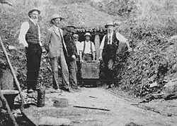 There was another rich gold mine, the Long Tunnel Mine, at the southwestern end of the modern-day locality.[35] Gold mining in that area dates from 1883,[36] but reef mining operations began in October 1894.[37] Originally known as the Long Flat mine, it was renamed the Long Tunnel mine, around 1897, after a 400 yard tunnel had been driven into the hillside to allow easier access quartz reef at the 180 foot level.[38] During this period the mine was owned by George Rice, discoverer of the reef, and James Robinson, the owner of the land upon which the mine was situated, the Kimo estate. Some very rich patches of reef were found, including a ton of quartz that yielded £1,000 worth of gold.[37]