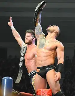 Ricochet (right) and Matt Sydal as the IWGP Junior Heavyweight Tag Team Champions in February 2016