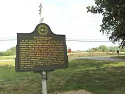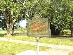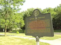 The site was recognized nationally when it was added to the National Register of Historic Places on December 10, 1982. It was officially listed as the River Raisin Battlefield Site (20MR227).[1] In July 1990, the Monroe County Historic Commission and the Monroe County Historic Society opened the River Raisin Battlefield Visitor Center within the site at 1403 East Elm Avenue. The museum contains a few relics from the original battle that were discovered during archeological investigations. The park holds a memorial service every January to commemorate all the soldiers who fought in the Battle of Frenchtown, including the British and Indian soldiers who were allied against the Americans.[12]