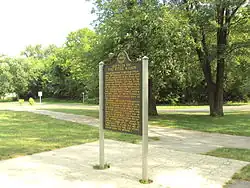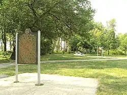 The River Raisin Battlefield Site was listed as a Michigan Historic Site on February 18, 1956, although the exact date at which the park was first organized is unknown. The location of the site is bounded by North Dixie Highway, the River Raisin, Detroit Avenue, and Mason Run Creek.[4][9] The Battle of Frenchtown is so named because it took place in and surrounding the Frenchtown Settlement (1784), on the River Raisin's north bank and within the present-day city limits of Monroe.[10] The area of conflict extended during the three days of battle several miles to the north and south of the current park site. After the battles, Frenchtown was gradually abandoned and the present-day city of Monroe developed from its downtown site 1.5 miles west and on the opposite bank of the River Raisin. The current park area encompasses some 40 acres (16 ha) of undeveloped land on Monroe's east side approximately one-quarter mile (0.4 km) west of Interstate 75. The area contains houses on the outer fringe along East Elm Avenue, and much of the area is occupied by urban development. The River Raisin Paper Company built a large paper mill on the site around 1911, which operated under multiple owners until 1995.[11]