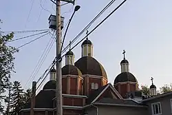 Ukrainian Orthodox Cathedral of St. George, August 2024Ukrainian Orthodox Cathedral of the Holy Trinity (1952) – The church features an eight-sided dome which depicts the major feasts of the Church and Saints. 22-karat gold was used to decorate the church's icons. In 1988 the front of the cathedral gained a bronze statue of St. Volodymyr, the Baptizer of Ukraine.[26]